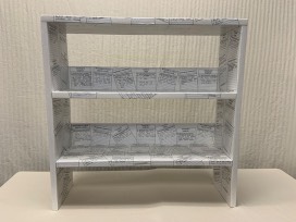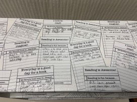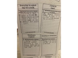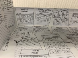 This adorable bookshelf is covered in "library cards" the 4th grade students filled out to share different aspects about their love of reading. Topics include things like their favorite book, their favorite character, and why they like reading. Bookshelf measures 24"x24"x6". Courtesy of Erin Keefe.