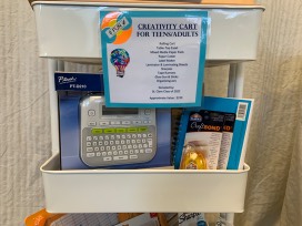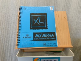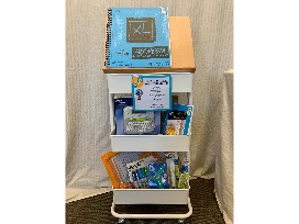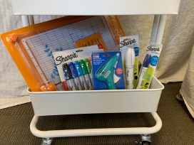 This item has everything a sophisticated crafter could want! The stylish rolling cart has ample space to hold all your crafting supplies: a table top easel, mixed media paper pads, laminator and laminating sheets, paper cutter, label maker, sharpies, glue gun and glue sticks, tape runner, and organizing jars.