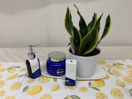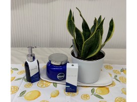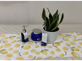 This basket is the perfect way to brighten your home and welcome spring. Items include a lemon 72" table runner, serving tray, Capri blue Volcano candle, hand soap and hand cream, and a pretty houseplant.
