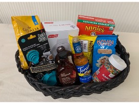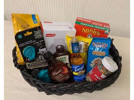 We have breakfast covered for you! This basket has everything to make the parents and kids happy in the morning. Items include: a Dash mini waffle maker, pancake and waffle mix, measuring spoons and cups, maple syrup, chocolate syrup, chocolate, chips, 2 bags of coffee, and hazelnut coffee syrup.