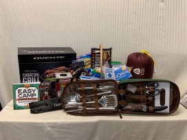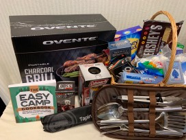 Whether you like to go camping or you want to make family memories in your own back yard, this basket has all the essentials covered. Items include: a portable charcoal grill, grilling and cooking utensils in a carrying case, camping cookbook, an outdoor insulated blanket, headlamp, waterproof playing cards, UNO game, Dominoes, Anomia playing cards, Coleman lantern, roasting sticks, items for s'mores, hot chocolate mix and more!