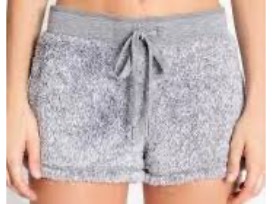 Spend the weekend lounging around in the comfiest outfit ever. PJ Salvage "Weekend Love" hat, gray cozy pj shorts (size L), furry moccasin slippers (size M) and a white camisole.