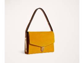 1Brand new, vintage-inspired butter suede bag with metal buckle on flap and adjustable strap. Will be shown on runway in Spring 2020, cotton canvas interior with divider. 11in L x 3in D x 2in H. Gold.