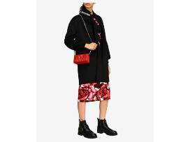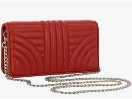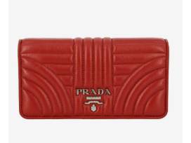 The Prada Diagramme mini luxe quilted lamb leather crossbody bag & wallet. Silvertone hardware. Removable chain shoulder strap. Flap top with double snap closure (7.25" wide x 4" tall 1.25" deep) with full length billfold, 6 credit card slots and room for phone. In deep, delicious red. Brand new and out of stock everywhere.