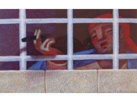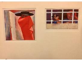 By French artist, Jean Charlot. Color lithograph, printed offset on aluminum. Signed and framed. Left: 6 x 6 inches/ Right: 2 3/4 x 6 inches