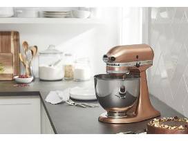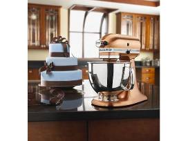 The KitchenAid Custom Metallic Series 5 Quart Tilt-Head Stand Mixer in Copper is Classic, Gorgeous, and Endlessly Useful. Lasting durability is ensured by a five-step custom plating process on the special series metallic finish. Tilt-back head allows for easy access to whatever you're mixing and the 5-quart bowl features an ergonomic handle for comfort. Features 59 point planetary mixing action reaches every part of the bowl; 5 rubber feet protect countertop; 10 mixing speeds. Includes flat beater, dough hook, wire whip, pouring shield, polished stainless steel bowl, powerful 325-watt motor. Measures 8.66" L x 14" W x 14" H