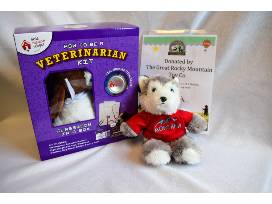 Just for kids! This delightful, interactive kit from Rocky Mountain Toy Company offers five activities from adopting a puppy, completing a nose to tail exam, measuring the dog, making healthy treats, and removing (fake) ticks! Valuable skills for veterinarians and pet owners alike! Kit contains adorable well-made plush puppy, single-head stethoscope, lab coat, student doctor name tag and more. Pages are reusable with the included dry erase markers. This package also includes a stuffed wolf for little animal enthusiasts.