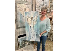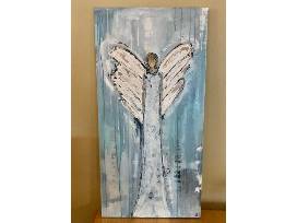 This ethereal palette painted Angel canvas measures 18x36 and is sure to bring you peace. Painted by Jenny Willett of Sweet Georgia Blue, located in the Queen of Hearts Antiques and Interiors, Alpharetta.