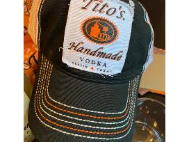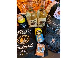 Tito's Vodka for Dog People basket including 2 liters of handmade vodka, zesty ginger beer, koozies and cups, a long sleeve T, hip bag and hat for cool wearable swag and some bandanas for your dog to style in!