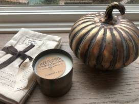 $50 gift certificate plus holiday items of a spiced candle, metal mosaic pumpkin and set of 4 napkins for your gatherings.