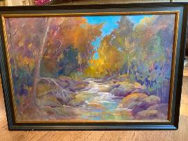 This large fall landscape featuring a rocky river at the height of fall color is 28"x40" and painted by C Hardy and titled 'Cool Waters'.