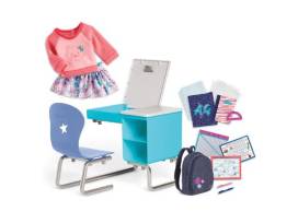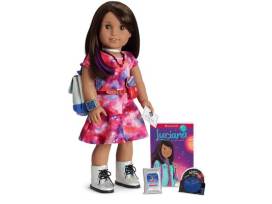 Meet Luciana. Package comes with a book about her, tortoise sunglasses, desk, locker and school set