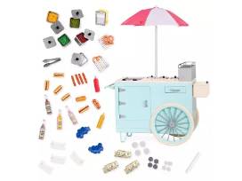 Our Generation Retro Hot Dog Cart - Enjoy playing with lifelike hot dogs and buns on paper trays and turning hot-dog grill Includes real chalkboard and chalk for daily specials, cart, umbrella, hot dogs, condiments, napkins, play money, soda bottles, pretzels