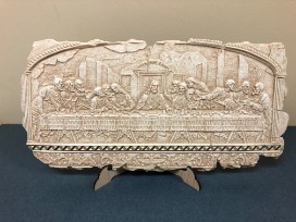 This stunning rendition of The Last Supper has been handcrafted by Italy's artisans, reflecting a centuries old traditions of skill, artistry and devotion to their work. This pieces comes with a stand for displaying on a table or if you prefer, it also has metal hooks on the back for hanging on a wall. Approximately 8" x 15".