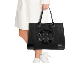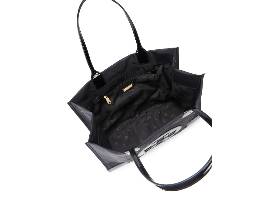 Utilitarian yet stylish tote bag emblazoned with signature logo and highlighted with glossy patent trim. Open top with magnetic closure, Side snap detail, interior compartment. Dual top handle, 8in. drop. 17in. W x 12in. H x 5in. D