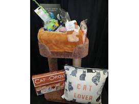 Cat lovers rejoice! Includes: Whisker City cat perch, Cat-opoly, cat lover pillow, "My Toasty Cat" bed, pet warming mat, snuggle safe heat pad, metal litter scoop, 2 cat toys, "Kitten Bandages", cat feet socks, "Every Day is Cat-urday" framed art!
