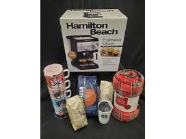 Cozy up with; A set of 4 cat coffee mugs, a Hamilton Beach espresso maker, Starbucks ceramic travel mug, 2- 1lb. bags of Starbucks Veranda coffee, 3lb. bag of Lavazza espresso roasted coffee beans and a beautiful plaid Sherpa lined 40x50 pet blanket!