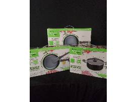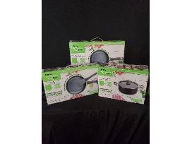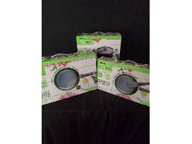 A 5 qt. Dutch oven w/lid, 11" frying pan w/lid, 9.5" frying pan, and a spatula