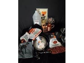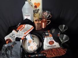 This great package includes A reusable Tito's tote, 1 gal. Tito's hand sanitizer, 1-LG t-shirt, 1 long acrylic scarf, 1-XL pullover sweater, 1 wall tin, a copper flask, 2 copper Moscow mule mugs, 1-ballcap, 1 big dog leash + collar, 1 big dog stainless food/water bowl and a bottle of Tito's Vodka