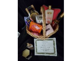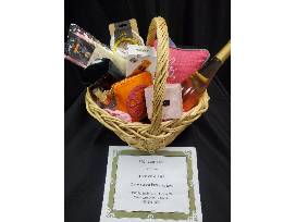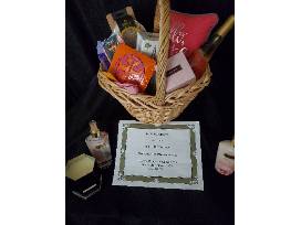 Refresh with the wonderful med spa basket that includes a carbon laser peel from Recreate Med Spa, white amber scented candle, Victoria's Secret Sheer Love fragrance mist and lotion, 1.7 oz. Prada eau du parfum, Tory Burch signature, reusable nylon foldable tote, crystal plaid perfume bottle, ice cream cozy socks, Earth Lux natural loofah, "hello beautiful" pillow, and a bottle of Open Kimono Reisling