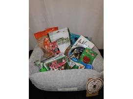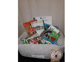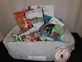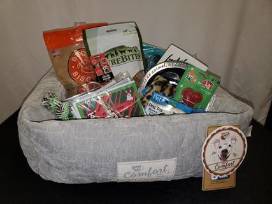 Grey Comfort dog bed, silver Pet Junkie dog bowl, Pet Junkie silver dog treat container, dog bandana, small dog sweater, assorted dog toys, Buddy Biscuits, Pure Bites treats, handmade dog Christmas cards, and more!