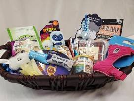 The basket comes with assorted treats and toys to keep your cat having fun and staying healthy. Includes 4 cans of assorted flavor Nulo Freestyle wet cat food, 4 assorted flavors of Nulo Freestyle lickable treats for cats, NaturVet Pumpkin Plus hairball aid, PureBites chicken and catnip treats, Kong Naturals catnip spray, Raw Rewards premium freeze dried shrimp treats, and a small pink Adventure Kitty harness + assorted toys!