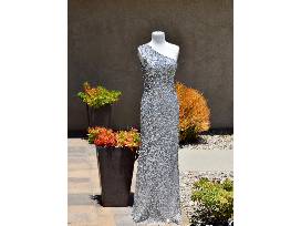 This is a rare opportunity to own a gown worn by Vanna White on Wheel of Fortune. This stunning Adrianna Papell silver sequined one shoulder sheath gown with side slit above knee is a size 4 and comes with a Letter of Transmittal from Vanna and a Certificate of Authenticity. It is in excellent condition, having only been worn the single time. Item can be delivered within the San Diego area; shipping charges will be applied if sent to other destinations.