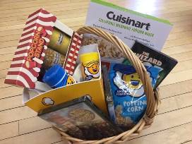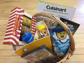 This package includes a Cuisinart Collapsible Microwave Popcorn Maker, a bag of popcorn, a popcorn bowl, two containers of popcorn seasoning, a Popcorn Stand kit, and three DVDs: The Sandlot, The Wizard of Oz, and Willy Wonka & The Chocolate Factory.