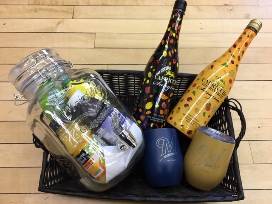 This basket contains everything you'd need to make a delicious sangria! It contains a one-gallon glass container with a spout, lemon juice, lime juice, orange juice, grape juice, two bottles of Capriccio sangria, and two Milwaukee Brewer travel wine cups