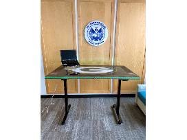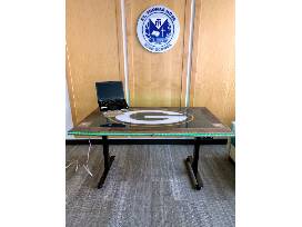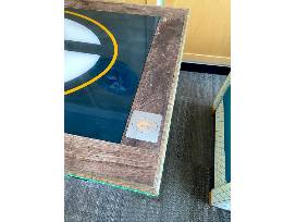 The Green Bay Packer Standing Desk measures 3' x 5'. The Packers logo is surrounded by ultra-durable wood-grained vinyl that is water-resistant and easy to clean. All desks are trimmed with solid oak and stained to match the wood-grained vinyl surrounding the Flag.