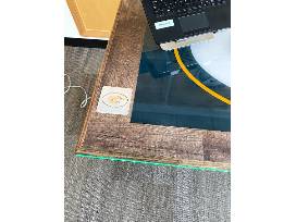 All desks come with various options, including a clamp-on keyboard tray, under the desk CPU holder, hidden wireless phone charger, monitor stands, and LED lights integrated into the oak trim.