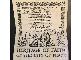 A limited edition Trinity Box (420/2500), made in pewter with 22K gold plate from the Heritage of Faith of the City of Peace and Handmade rosary bracelet by the Carmelite Sisters. The Rosary is 14K gold filled with pearl and blue goldstone.