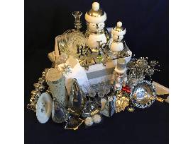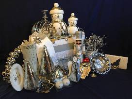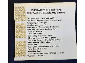 Two glass Angels, two silver Christmas Trees, Large and small penguin jars, four mimosa flutes, four appetizer plates, Silver Bell wreath, Silver wire basket, small candy bowls, Silver sleigh napkin holder, Silver and White Nutcraker, Box of wine, Crystal Candle holders with candles, Glass Blown Bowl, two Silver Stocking holders and two kitchen towels.