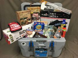 St. Bernard - Cooler filled with 4-person tent, gas stove, foldable shovel, mallet, 1st aide kit, flashlight, tent light, camping dish set, canteens, poncho, bug spray, sun screen, playing cards, campfire cook book, s'mores supplies, skewers, St. Bernard Prayer Card, and a St. Bernard Necklace.