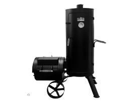 - Smoke Canyon Vertical Smoker: Offering 1,100" sq. in. of cooking space over 5 chrome-plated cooking grates through the main vertical smoking chamber, this vertical design also features 6 chrome-plated hooks at the top of the smoking chamber to hang sausages, hams, racks of ribs, and other large items. Made of a heavy-gauge, cold rolled steel with heavy-duty latches for a trustworthy seal that holds the smoke and heat inside the smoker. The 3" temperature gauge built into the smoking chamber door helps you monitor and maintain a consistent cooking heat from the smoker's offset firebox, which doubles as a charcoal grill with its 2-piece, porcelain-coated cooking grate. 45.5"x25.5"x56.25"