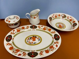 1A beautiful 8-Piece Antique China set by "Liling: Takara" This includes: 8 teacups, 8 saucers, 8 dinner plates, 8 salad/soup bowls, 8 dessert plates, one (1) large oval serving, and one (1) side dish bowl, one (1) creamer, and one (1) sugar bowl with top.
