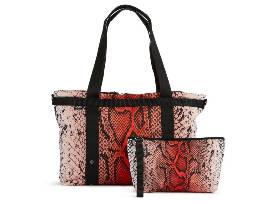 Bring functionality to your fit life with the signature ANDI bag in Persimmon Snake Print. The signature ANDI bag is virtually weightless with comfortable non-slip shoulder grips. This piece transforms from tote to crossbody to a backpack when you need to be hands free. It also easily slips over a roller suitcase. The ANDI signature bag is sized to fit most laptop computers, a water bottle, a pair of shoes, clothes, as well as additional accessories and snacks. The removable inside clutch is designed to hold a wallet, phone and keys for when you need to run out with just the essentials. No returns or exchanges. H 12" x W 15½" x D 6"