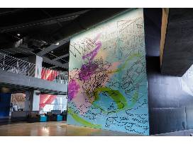 The two diamond motifs that reflect each other represent the rooftop of the old Dome. Those two shapes anchor the cityscape in between to open the Mercedes-Benz Stadium and the community that surrounds it. The signature retractable roof, the map of the Westside, the colorful brushstrokes and detail carry this composition before you. The mural is designed to guide the viewer along a landscape that is provocative, striking, bright and interactive.