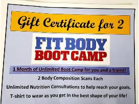 - Fit Body Boot Camp gift certificate for 2 for 1 month of unlimited boot camp