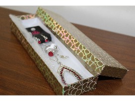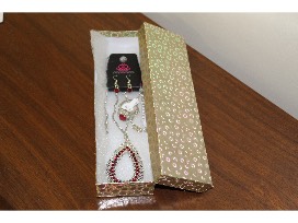 1A beautiful white metal necklace and earring set with red insets and a ring with rhinestones and red insets.