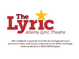1This certificate for the Atlanta Lyric Theatre is good for $122.00, the average price of two premium tickets, and may be redeemed at any mainstage shows in the Lyric's 2019-2020 season.