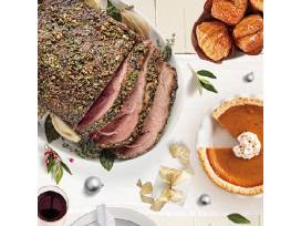 Hormel USDA Select Prime Rib (5-6 lbs.), two large sides of mashed potatoes, beef gravy (32 oz.), 12 dinner rolls and your choice of two large side dishes.