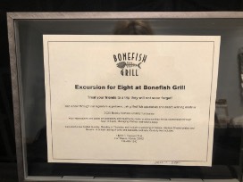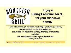Enjoy a dining excurision for 8 at Bonefish Grill. Take a trip through the menu, enjoy signauture martinis and 2 bottles of wine. A really fun experience! Premier Auction Saturday Night.