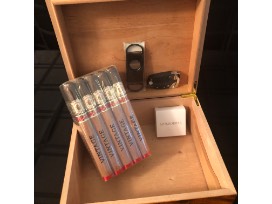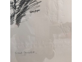 An inspirational intaglio print of Winston Churchill, signed by his daughter Sarah Churchill. This beautifully framed 38" x 44" sketch is part of a series of 28 portraits of Winston Churchill. Each print bears a quotation from Churchill's life, and the quote on this print is "Never in the field of human conflict was so much owed by so many to so few." The prints are signed on the plate and on the print by the artist, Curtis Hooper. They also contain the embossed armorial seal of the House of Churchill. Numbered 103 of 300, this piece is a must for any Churchill admirer. A humidor and cigars is also included in honor of Sir Winston. Premier Auction Saturday Night.