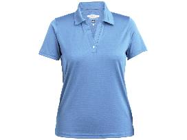 Two (2) Women's Ottoman Stripe Polo golf shirts in coral and regatta blue colors.