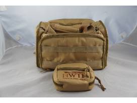 Tan, water resistant gun care bag with 4 zipper compartments and embroidered NWTF logo. Includes 10 gun cleaning brass brushes. Dimensions: 12" x 9" x 9". Shell bag of same design with room for 10 shells. Dimensions: 5"x 5" x 3".