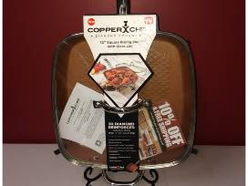 12 inch square non-stick Copper Chef frying and saute pan with glass lid. Fry or cook food with minimal oil. This skillet features a 3-D diamond texture pattern that creates air pockets between the surface and your food, so food practically floats out of the pan! The stainless steel induction plate bottom distributes high heat quickly and evenly to the entire cooking surface to make perfect steaks, vegetables, omelettes, pancakes and more. This pan also works well in ovens.