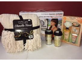 Treat someone to delicious relaxation with this package - a compact personal massager with heat therapy and powerful deep-kneading Shiatsu action plus a warm & cozy chenille throw, 5-piece bath set, and two travel mugs with cocoa mix.