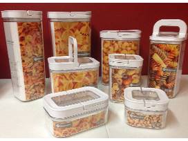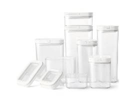 This Flip Lock Container Set includes 4 rectangular and 4 square containers to organize your pantry with ease. Store a variety of dry foods with these sleek and space saving containers. The lids feature a clear window to see the ingredients from the top. The silicone lid seal provides maximum and prolonged freshness and the ring can be used as a convenient handle.