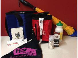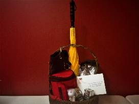 This basket includes four (4) Juday Creek courtesy 18-hole golf passes with cart, two (2) Kroc Center free day passes, a Parkwood Auto Spa car wash certificate, 4 golf towels, 4 clear carry bags, an umbrella, golf balls & tees, and a tiny insulated golf bag stuffed with various personal items for your golf outing.